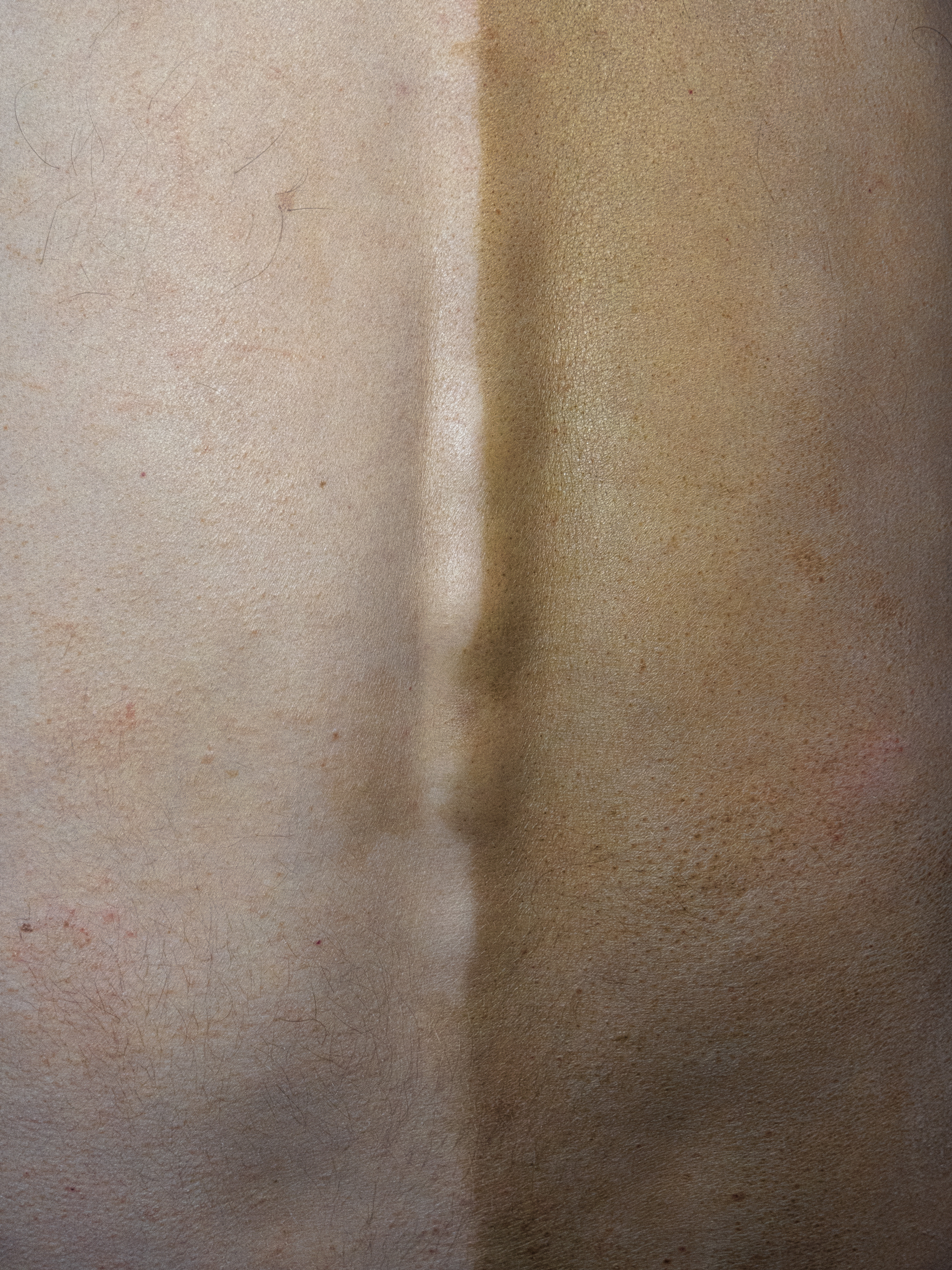 Fake tan (2019). The piece started as a durational performance when applying self tanning mousse for half of the body and face while I was living for a short period of time in Northern Ireland where the use of self tanning products was a very visible phenomenon. Getting tanned for only half of the body was a way to visually conceptualise the tendency for polarization in the society and also to bring visible a line between what could be considered “natural body” and a body temporally modified by a beauty product. I continued to live normal life with the half fake tan for the five days duration that the tanning lasted. After a photo session with a photographer the visual presentation of the piece formed to be a photo print of my half tanned back.
